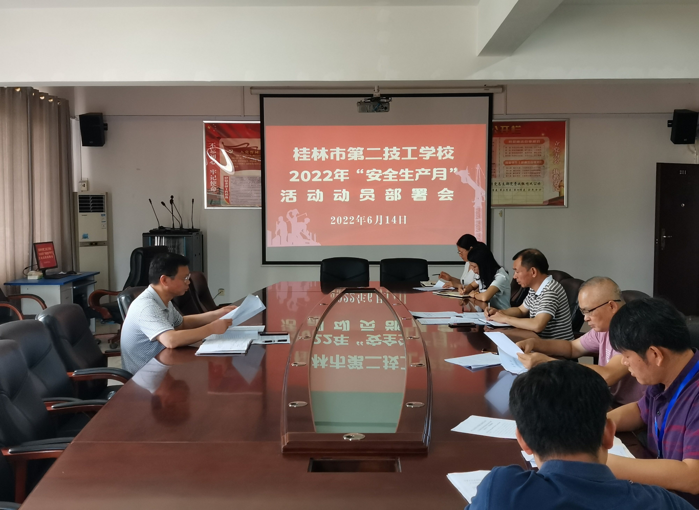 为了将安全生产活动落到实处,2022年6月14日,工会龙克俭主席主持召开了“安全生产月”活动动员部署会,学生科、保卫科、总务科、教务科、校办等相关科室负责人参加了会议。会上,龙克俭主席传达了市人社局相关会议精神,学习了安全生产的有关文件,强调了学校安全生产工作的重要性和必要性,并就相关科室在安全生产月活动中要开展的工作做了布置。