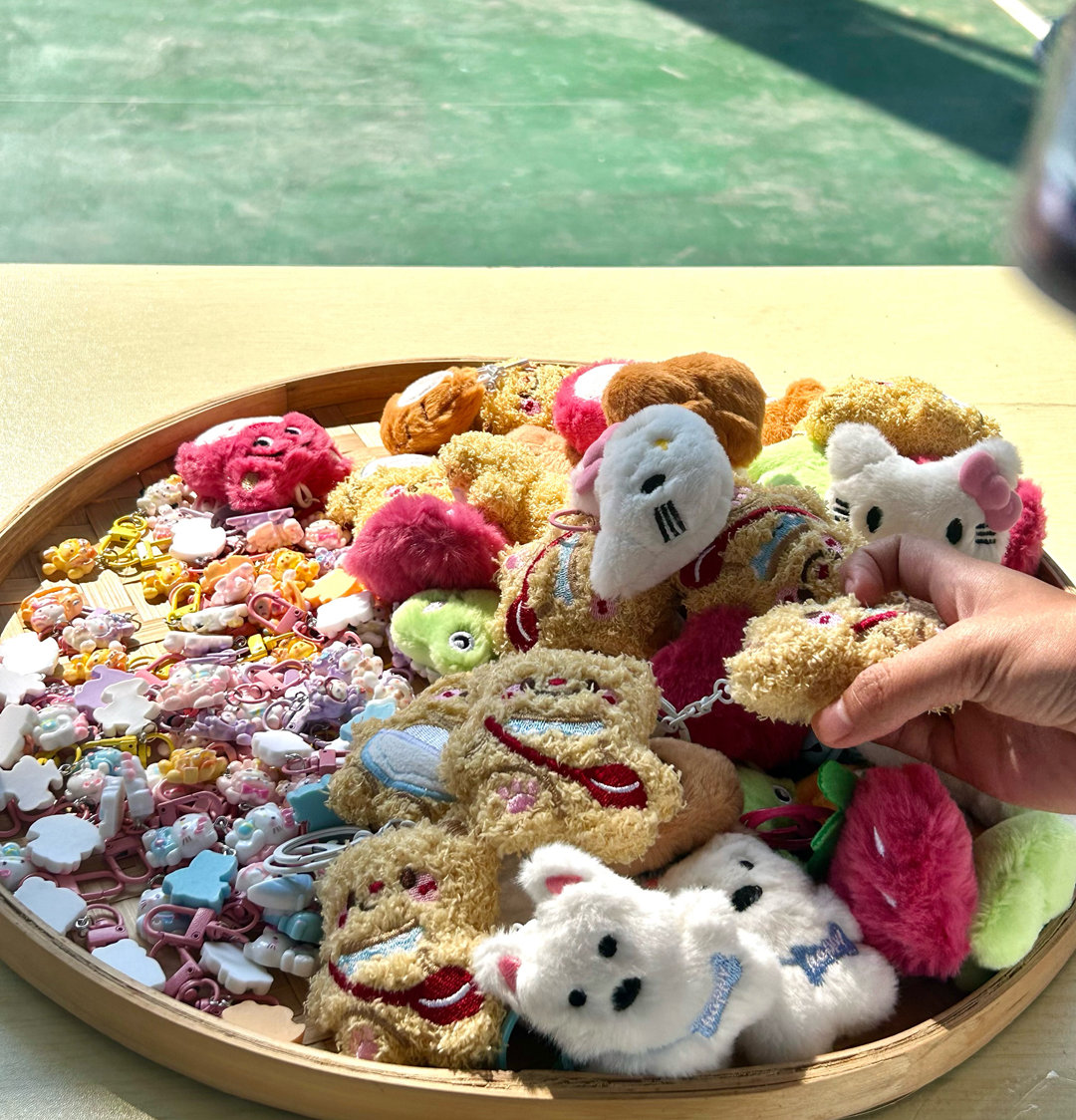 潮玩创意区·DIY手作摊——摊位陈列学生手作成果,色彩鲜亮、创意鲜活,阳光与手作相映,氛围温暖欢乐,吸引师生驻足交流。